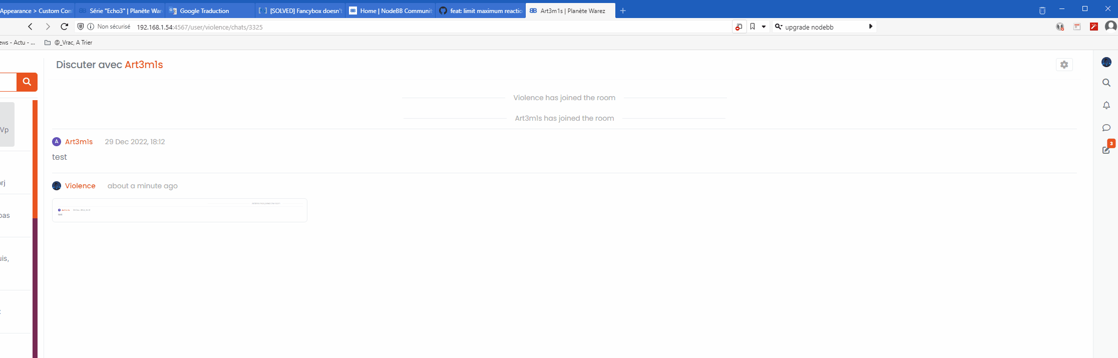 EDIT: Sorry all, I found a bug that causes Fancybox to be bound twice. Please remove the original functions I provided (the original post has been updated for anyone who did not use the original code and is new here) and replace with just this block // Chat fancybox - fires when chat module loaded and AJAX calls new chat $(document).ready(function() { $(window).on('action:chat.loaded', function(data) { this.$('img').not('.forum-logo').not(".avatar").not(".emoji").not(".bmac-noanimate").each(function() { var newHref = $(this).attr("src"); $(this).wrap("<a class='fancybox' href='" + newHref + "'/>"); $('a[href*=".jpg"], a[href*=".jpeg"], a[href*=".png"], a[href*=".gif"], a[href*=".webp"]').addClass("noanimate"); data.preventDefault(); // Strip out the images contained inside blockquotes as this looks nasty :) $('blockquote img').remove(); }); Fancybox.bind( 'a[href*=".jpg"], a[href*=".jpeg"], a[href*=".png"], a[href*=".gif"], a[href*=".webp"]', { groupAll: true, } ); }); });