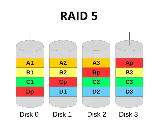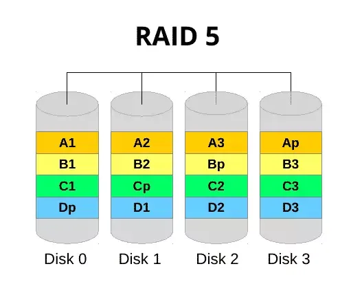 to my team member, our central helpdesk number lit up like a Christmas tree in Times Square with users complaining they couldnāt get into email. I literally ran into the comms room and found the server with all drive bays lit solidly as if suspended in its own cryogenic state. For sake of schematics, a standard RAID5 configuration looks like the below. Essentially, the āpā component is parity. This is the stripe that contains information about the array and is spread across all disks that are members. In the event that one fails, the data is still held across the remaining drives, meaning still accessible - with a reduction in performance. The data is written across the disks in one write like a stripe (set).