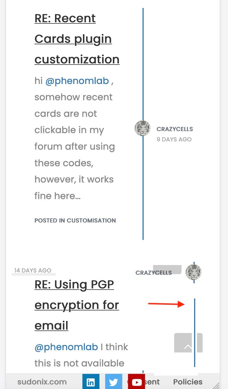 - here it is@media (max-width: 767px) { .posts-list .posts-list-item { width: auto; } .posts-list .posts-list-item .post-body { border-right: none !important; width: 100%; } .posts-list .posts-list-item .post-info { position: revert; left: 0px; width: 500px; } .posts-list .posts-list-item .post-info .post-author { max-width: none !important; display: flex; } .posts-list .posts-list-item .post-info .post-author span { margin-left: 10px; } }Some other adjustments to get even more estate on mobile (30px either side) - your tastes may vary